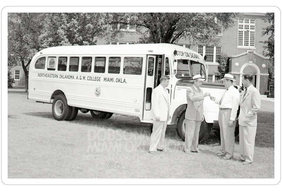 Coyne Lumber, an early Miami business located on East Central. Men in the cars: Ern Shriver, Pete McCollagh, Elmer Bigham, Walt Williams, Ben Standifer, Ed Milner.