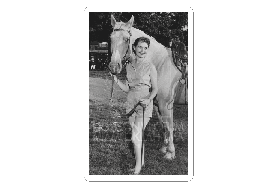 Norma Sue Davis, 1956 Oklahoma State Dairy Princess and her horse Fellas identified by Larry and Judy Davis.